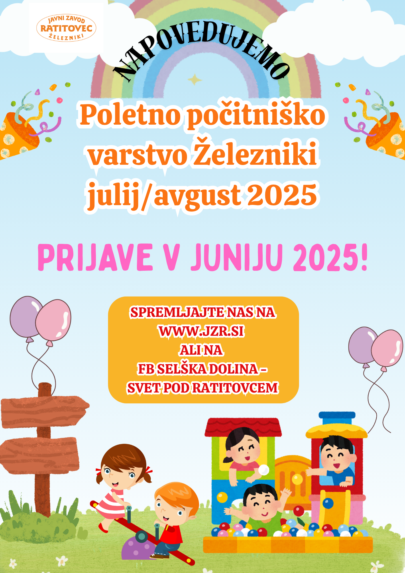 Prijave za počitniško varstvo v organizaciji Javnega zavoda Ratitovec se bodo začele zbirati junija in bodo elektronske. Varstvo bo organizirano v juliju 7.7. do 11.7 in pa še v avgustu 25.8 do 29.8. Več informacij dobite na telefonu 04 510 04 10.