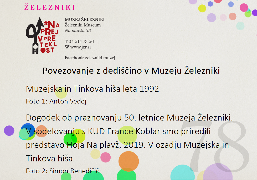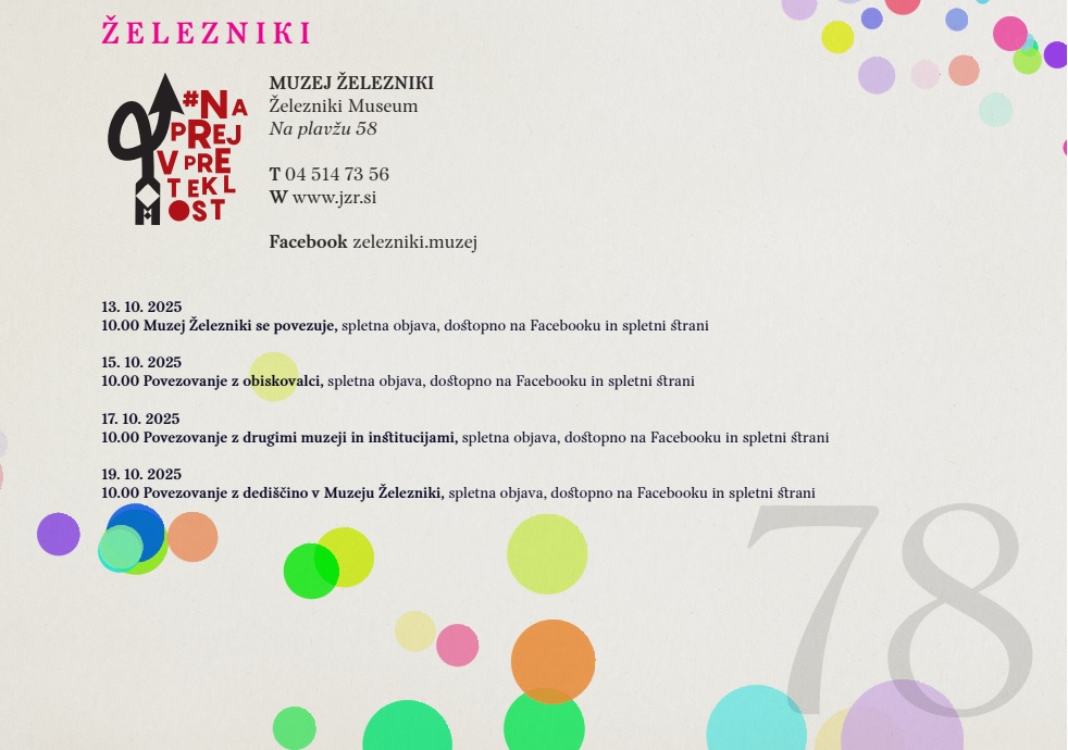 Muzej Železniki se pridružuje slovenski muzejski spletni akciji #naprejvpreteklost. Slovenski muzeji bomo v času med 13. in 19. oktobrom 2025 predstavljali dediščino, ki jo hranimo. Geslo tokratne akcije je "Povezovanje skozi čas".